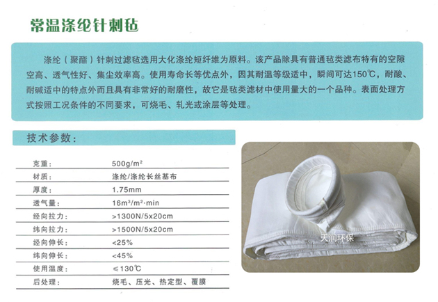 滌綸針刺氈除塵器濾袋選用滌綸細(xì)旦大化纖維絲,以_設(shè)備生產(chǎn)滌綸(聚酯)纖維針刺過濾氈,可將多種纖維均勻定量混合,再用多臺(tái)混開棉機(jī)組及梳理機(jī)組利于纖網(wǎng)之間不同纖維間層裝復(fù)合、梯度變換。該產(chǎn)品除具有普通氈類濾布_的空隙度高、透氣性好、集塵效率高、使用壽命長等優(yōu)點(diǎn)外,因其耐溫等級(jí)適中,瞬間可達(dá)150℃,耐酸、耐堿適中的特點(diǎn)外而且具有非常好的耐磨性,故它是氈類濾材中使用量大的一個(gè)品種。